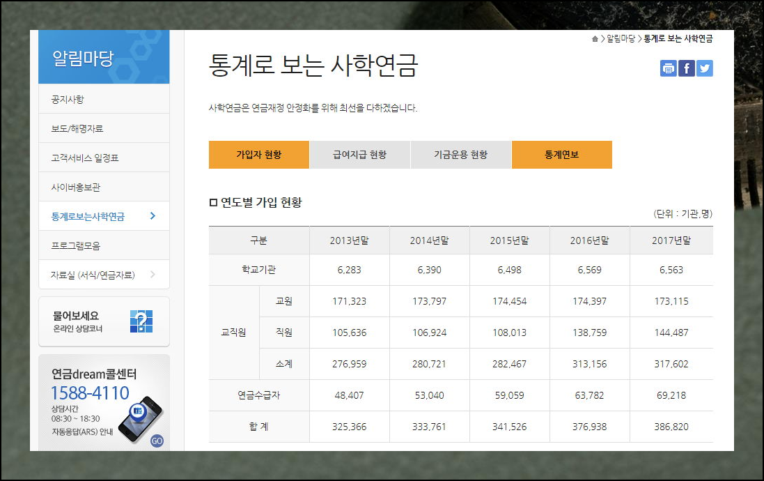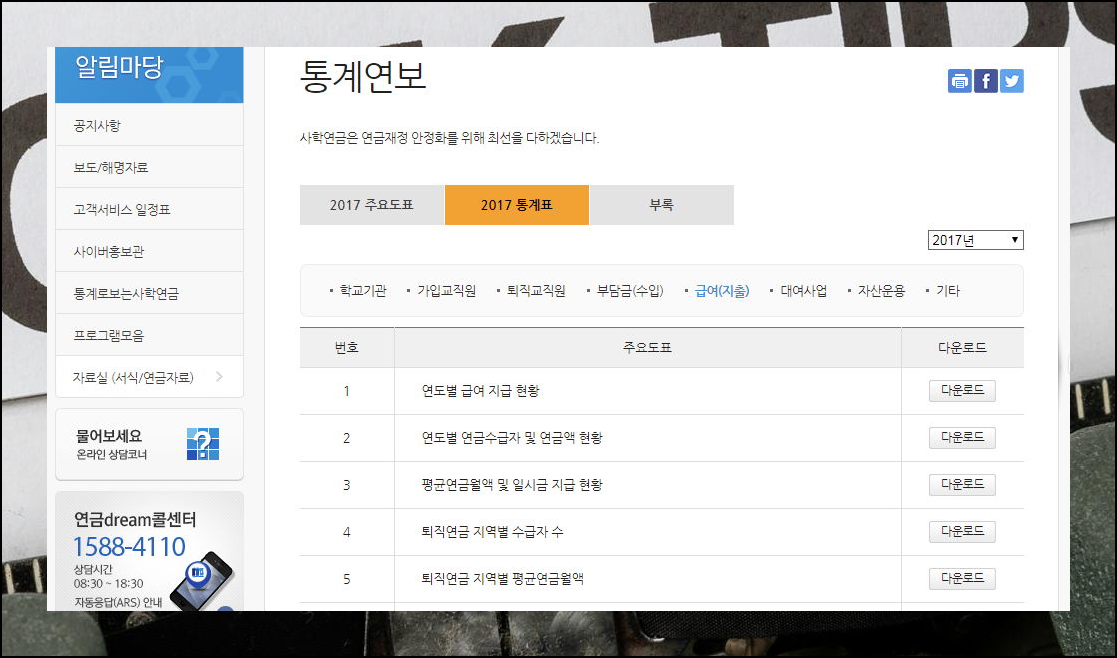 통계로 보는 사학연금에서 맨 오른쪽에 있는 통계연보를 클릭해 주세요.