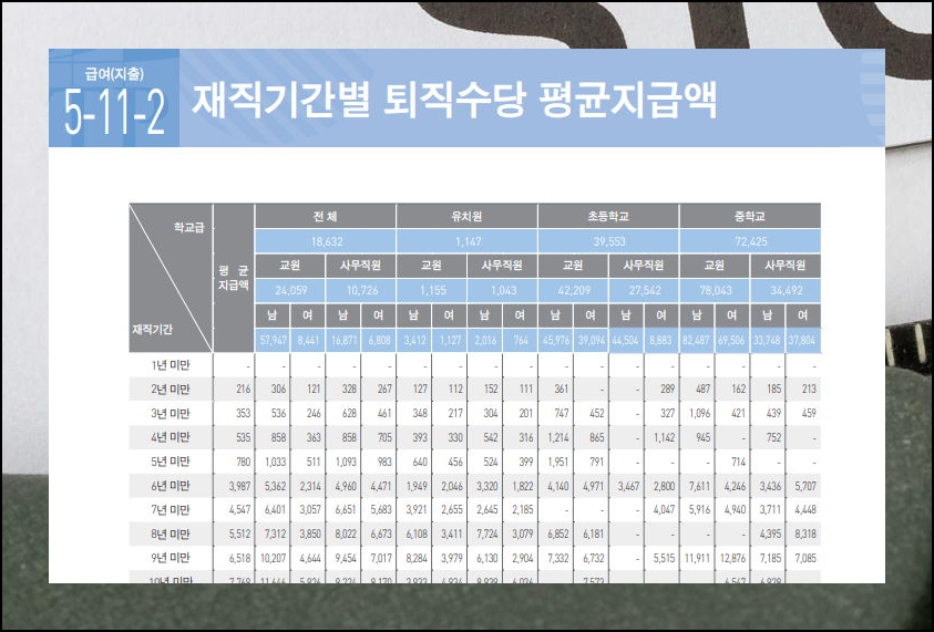 퇴직수당 평균지급액입니다. 재직기간이 늘어날수록 받을 수 있는 금액이 늘어나는데요. 유치원, 초등학교, 중학교, 고등학교, 전문대학, 특수학교 등 기관에 따라서도 어느 정도 차이가 있습니다.