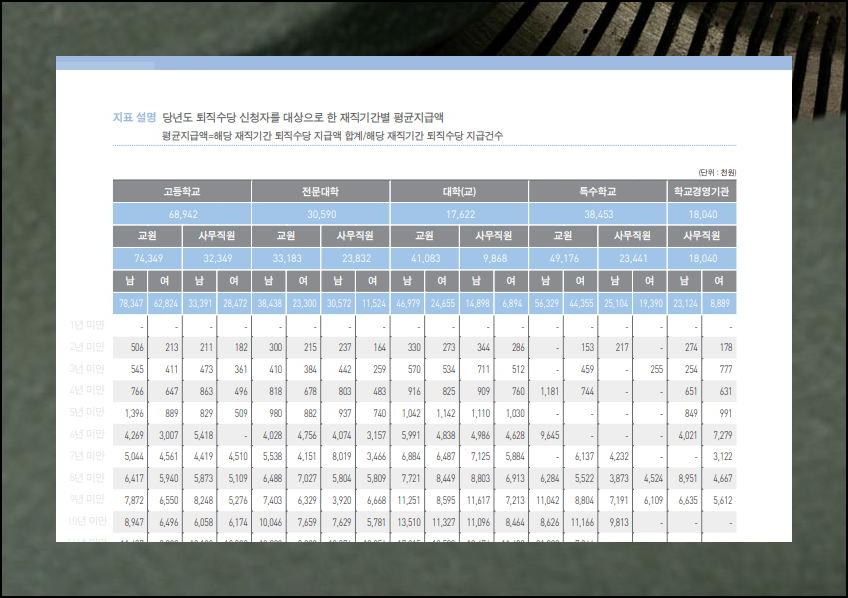 퇴직수당 평균지급액입니다. 재직기간이 늘어날수록 받을 수 있는 금액이 늘어나는데요. 유치원, 초등학교, 중학교, 고등학교, 전문대학, 특수학교 등 기관에 따라서도 어느 정도 차이가 있습니다.