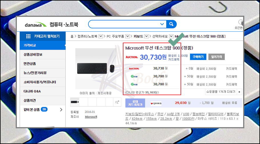 마이크로소프트의 무선 데스크탑 900은 "3만 3천원" 수준으로 저렴하게 무선키보드 마우스 세트 구매가 가능한데요. 세트 구매의 이점을 충분히 살린 합리적인 가격이에요.