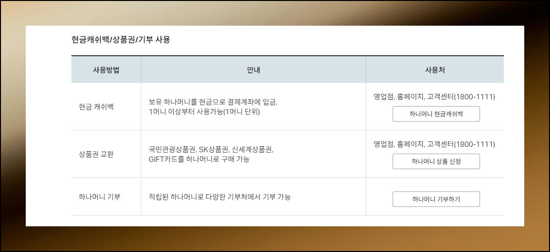 하나머니 포인트 사용법은 크게 3가지로 분류가 될 수 있는데요. 첫째, 카드대금을 결제할 때 사용할 수 있습니다. 둘째, 상품권으로 변경하거나 캐쉬백 방식을 통해 현금으로 받을 수 있습니다. 셋째, 가맹을 맺고 있는 온라인 및 오프라인 사용처에서 사용할 수 있습니다.