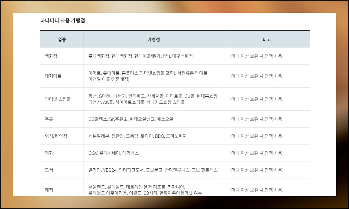 업종에 따른 하나머니 사용처를 알아보겠습니다. 백화점, 인터넷쇼핑몰, 주유소, 영화관, 서점, 놀이공원 등 다양한데요. 제 경우에는 이마트, G마켓, 세블일레븐, 알라딘을 주로 이용합니다. 하나머니의 경우에는 1머니도 사용할 수 있으니 모아서 한 번에 사용할 필요도 없어요.