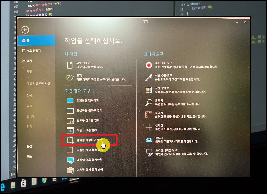픽픽 프로그램을 실행했습니다. 첫 화면에 나타난 여러 가지 화면 캡쳐 도구가 있는데요. 여기에서 마음에 드는 것을 선택해 주세요. 저는 영역을 지정하는 방식을 선호합니다.