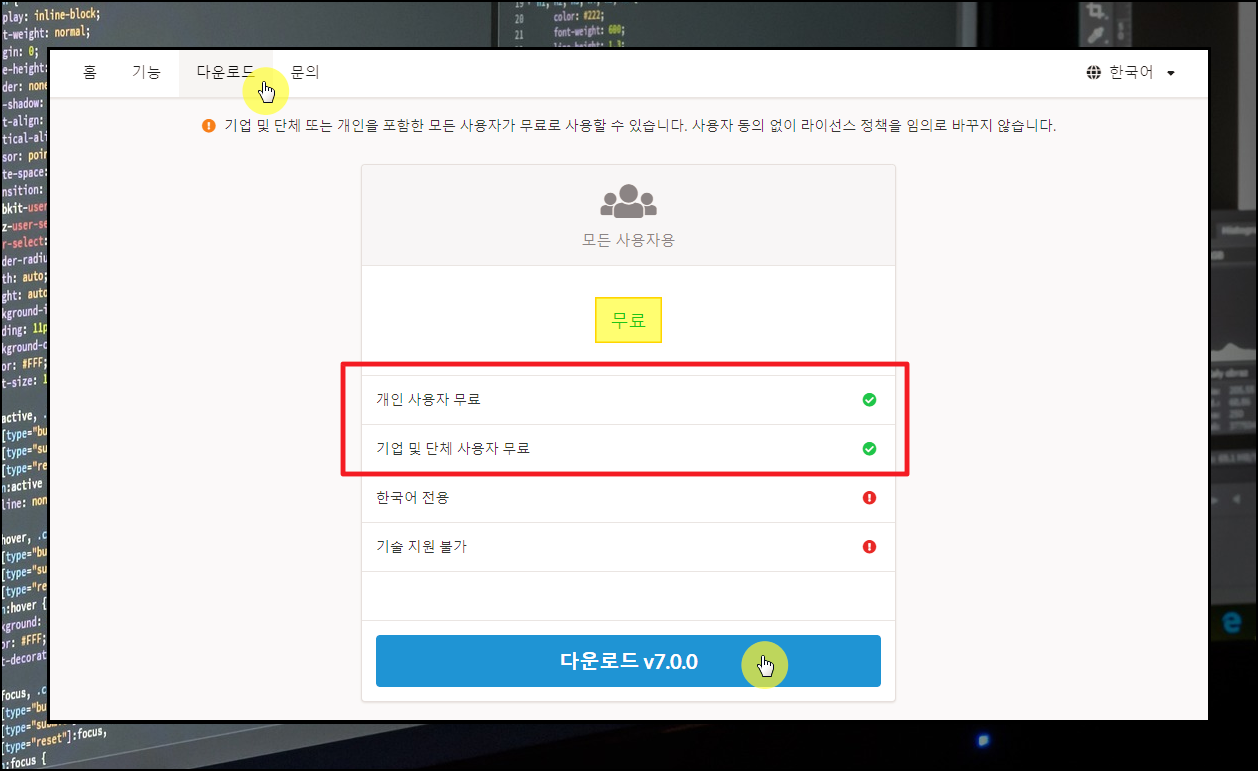 픽픽 공식 홈페이지에 접속하여 메뉴에 있는 [다운로드]를 선택해 주세요. 그럼 픽픽 프로그램을 설치할 수 있는 파일을 다운로드 받을 수 있습니다. 개인이든 기업이든 단체든 모두 무료 사용이 가능하기 때문에 전혀 부담이 없습니다.