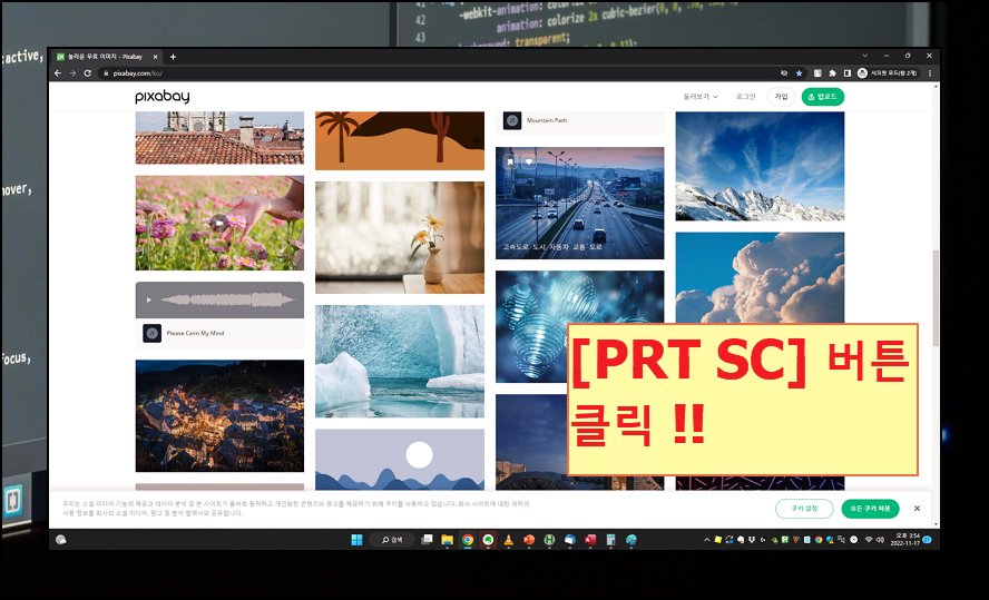 컴퓨터를 이용하여 인터넷이나 게임 또는 업무를 진행할 때 화면을 이미지 파일로 저장하고 싶을 때가 있습니다. 이 때 키보드에 있는 [PRT SC] 버튼을 쿨러주세요. 해당 버튼이 안 보이면 [print screen]이나 [print sc]를 찾아서 클릭하면 됩니다.