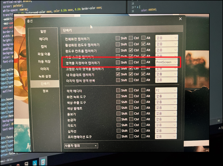 저는 프로그램에서 캡쳐 도구를 선택하는 방법 대신에 단축키를 사용합니다. [옵션]에서 [단축키] 메뉴로 들어가면 여러 가지 기능에 대한 단축키 설정이 가능한데요. 제가 가장 많이 사용하는 [영역을 지정하여 캡쳐하기] 기능에 대한 단축키를 [Print Screen]으로 변경해 놓았습니다. 이렇게 해 놓으니 사용하고 싶을 때 바로 사용할 수 있어서 좋아요.