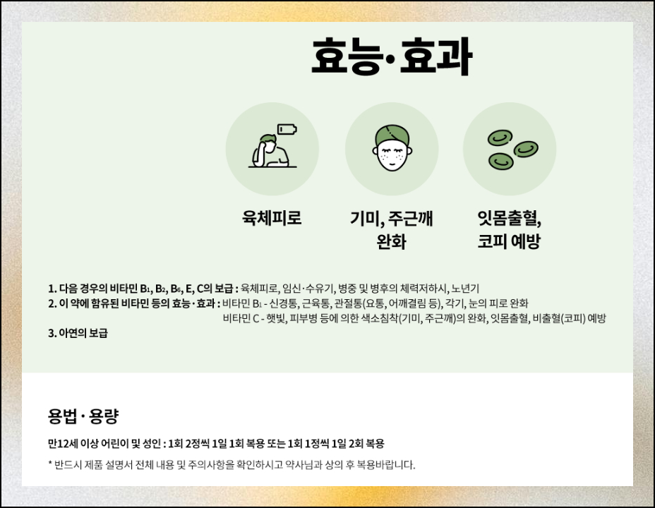 어른을 위해 개발된 종합비타민으로 하루 최대 2회까지 복용이 가능합니다. 1회 기준 1정을 드시면 되니 간편하죠. 아로나민골드 씨플러스의 가격을 고려하면 정당 350원에서 400원 정도의 비용이 발생한다고 보면 됩니다. 해당 제품은 식후 복용을 권장합니다. 공복에 섭취하면 위장에 부담이 될 수 있으니 반드시 식사 후에 복용하시길 바랍니다. 규칙적인 복용이 효과를 극대화할 수 있는 방법이에요.