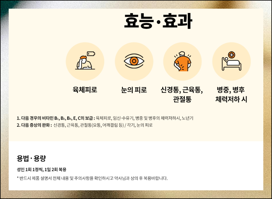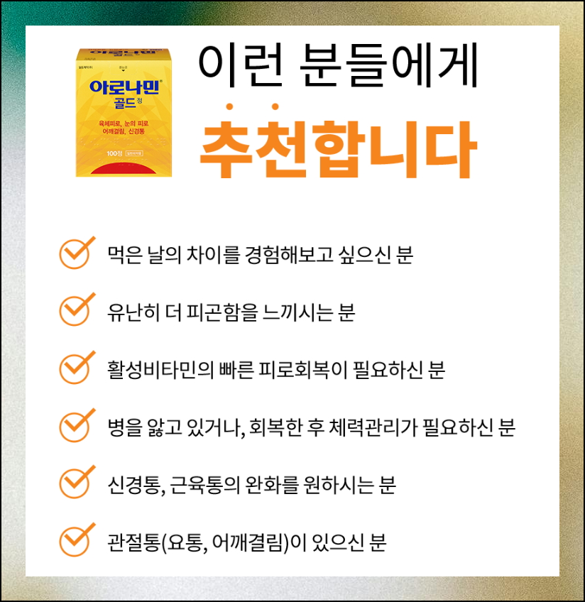 아로나민골드는 체력 저하나 신경통으로 고민하는 분들에게 추천하는 제품이네요. 특별한 원인 없이 피로감을 느끼거나 회복기에 있는 분들이 아로나민골드를 섭취하면 좋은 결과를 기대할 수 있습니다. 장시간 업무나 학업으로 지친 분들, 스트레스로 인한 체력 저하를 겪는 분들에게도 도움이 될 수 있어요. 현대인의 피로 회복에 초점을 맞춘 제품이라고 할 수 있죠.