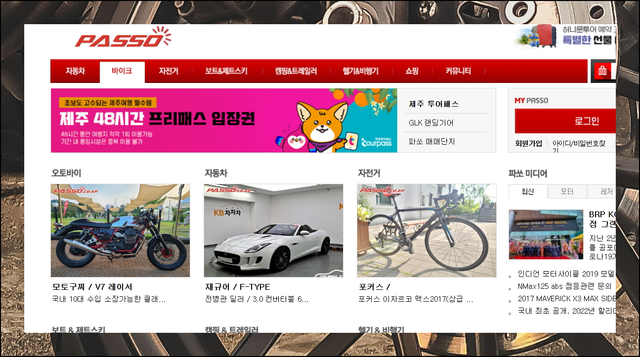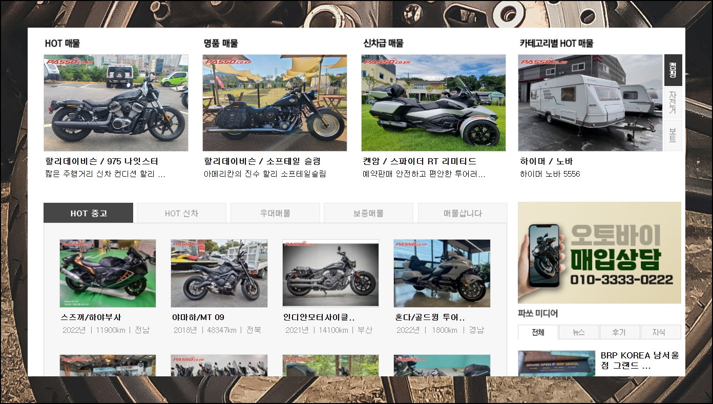 파쏘는 다양한 이동수단을 아우르는 종합 차량 거래 사이트예요. 오토바이 전용 섹션에서 사이버 매장을 통해 중고 매물을 둘러볼 수 있습니다. 전문성 있는 정보와 함께 매물을 살펴볼 수 있다는 특징이 있어요.