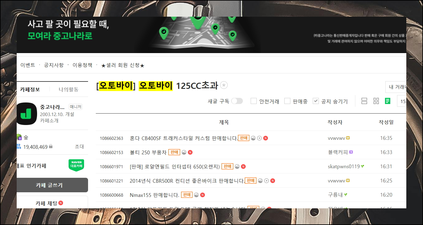 중고나라는 국내 최대 규모의 중고 거래 플랫폼으로, 다양한 오토바이를 접할 수 있어요. 다만 이용자가 많은 만큼 거래 시 주의가 필요한 판매자도 있을 수 있습니다. 사이트에서 제공하는 안전거래 팁을 참고하면 좋습니다.