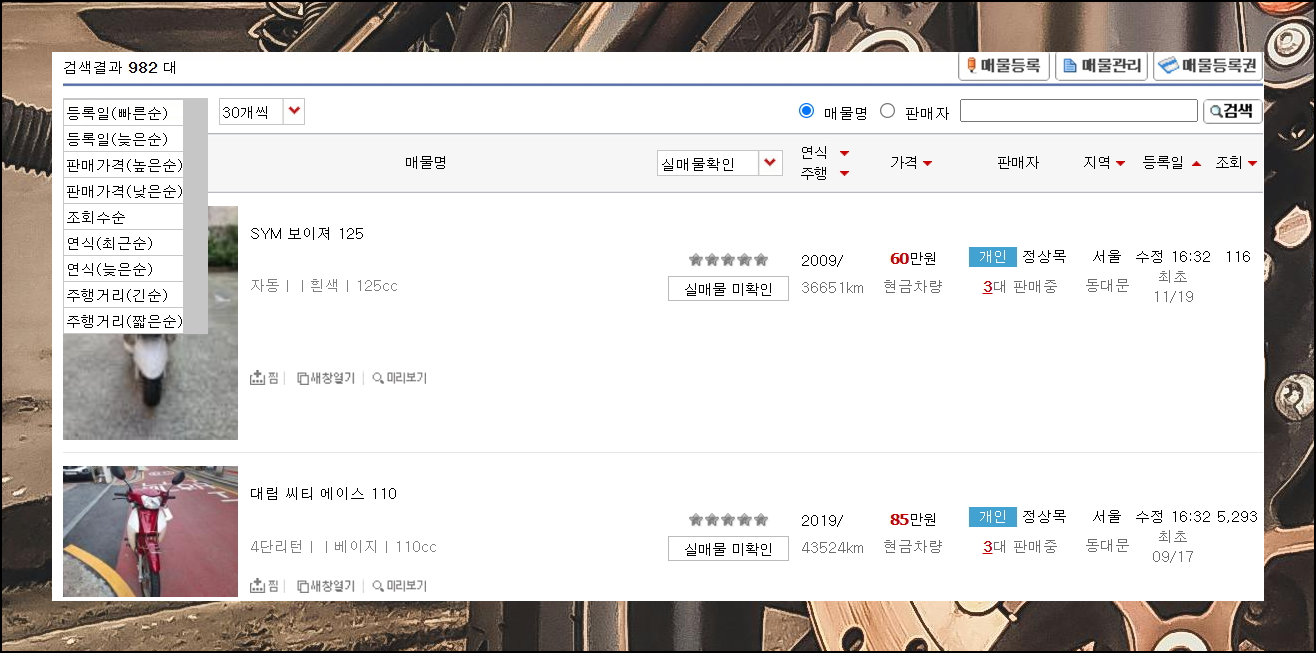 물건 검색 시 상세한 정보와 사진이 한눈에 들어오도록 구성되어 있습니다. 화면 좌측 상단의 정렬 기능을 활용하면 등록일, 가격, 조회수 등 다양한 기준으로 중고 매물을 정리해볼 수 있어요. 이를 통해 더욱 효율적인 오토바이 매물 탐색이 가능하며, 사이트의 편리한 UI가 큰 도움이 됩니다.