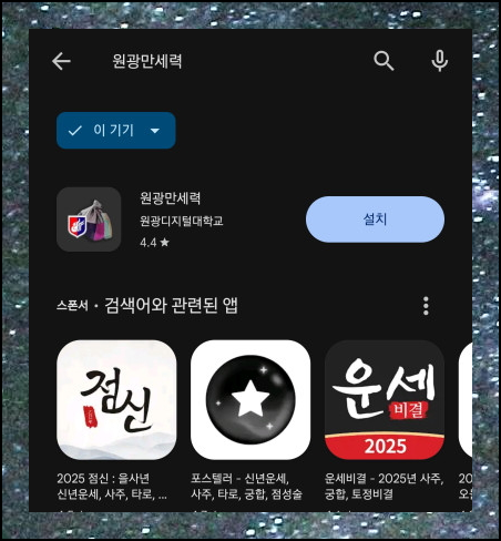 인터넷이 연결된 상태에서 플레이스토어를 실행하고 원광을 검색하면 무료 만세력 앱을 쉽게 찾을 수 있습니다. 인터넷 환경이 안정적이라면 더욱 빠르게 설치할 수 있어요.