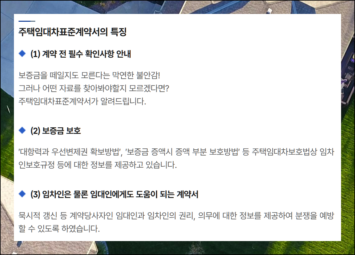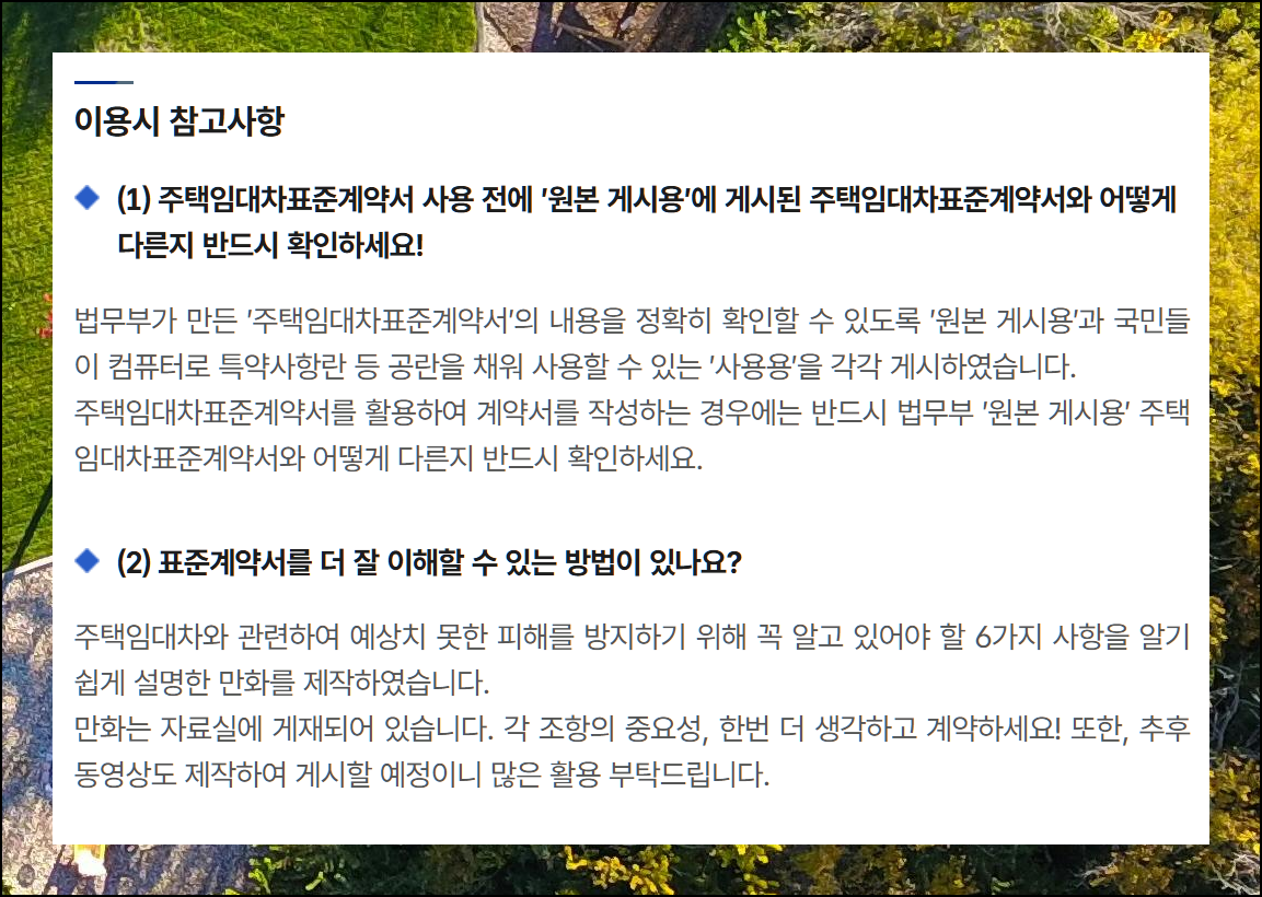 주택 임대차를 진행하는 경우에는 사이트 상단의 메뉴에서 주택임대차표준계약서를 클릭해보세요. 아파트부터 빌라, 전원주택까지 다양한 주거 형태에 맞는 전월세 양식을 무료로 이용할 수 있습니다.