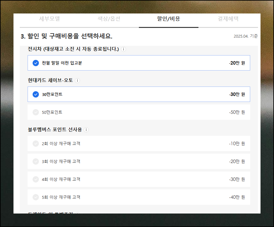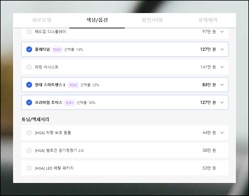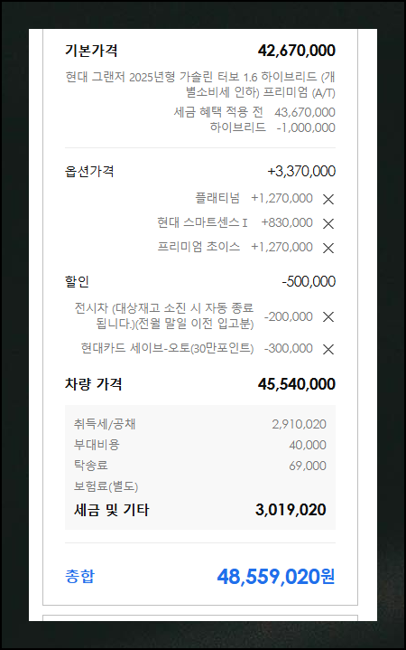 모델과 옵션을 결정한 후에는 적용 가능한 판매조건을 선택하세요. 하지만 차량 구입에는 기본 금액 외에도 추가 비용이 발생합니다. 취득세, 공채, 탁송료까지 모두 포함한 총액을 신차 가격표에서 확인할 수 있으니 꼼꼼히 살펴보세요.