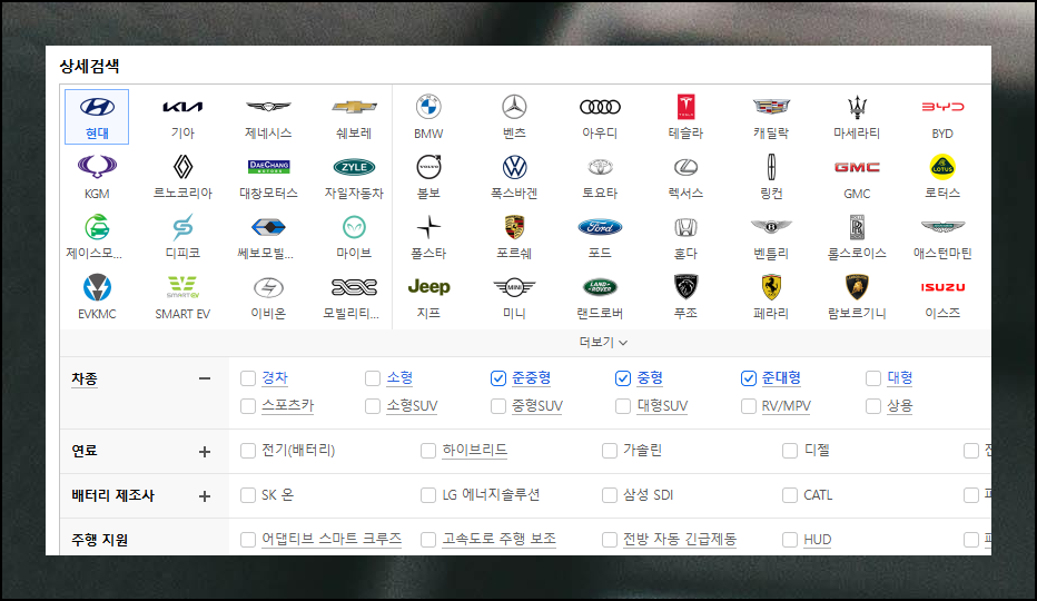 자신에게 적합한 차량을 찾으려면 원하는 조건을 하나씩 지정해보세요. 주행 지원 장치, 연료 유형 등 필요한 기능을 선택하면 됩니다. 많은 분들이 선호하는 SUV는 물론이고, 준중형, 중형, 준대형 차종만 살펴보는 것이 가능해요.