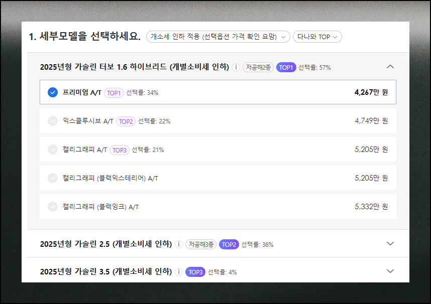"신차 견적내기" 버튼을 누르면 세부모델과 옵션별 가격표를 확인할 수 있습니다. 원하는 모델과 사양을 선택하면 오른쪽에 자동으로 합산됩니다. 인기 있는 옵션으로는 현대자동차의 안전기능 장치, 네비게이션, 전방 센서, 눈부심 방지 백미러 등이 있습니다.
