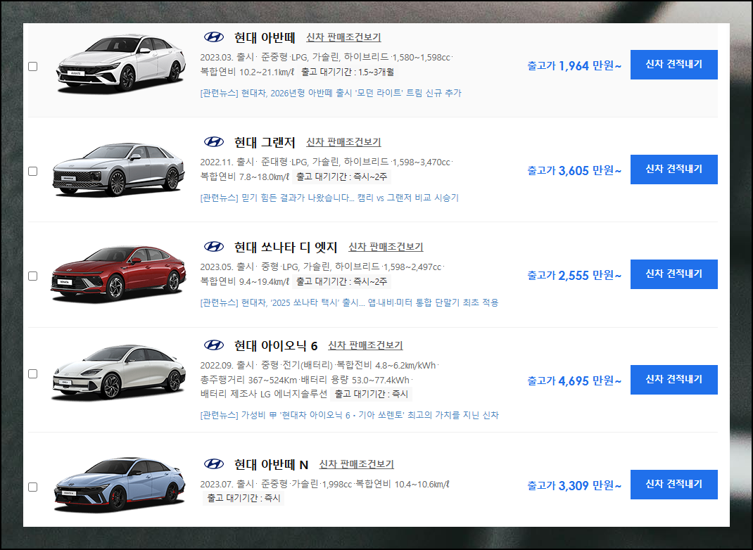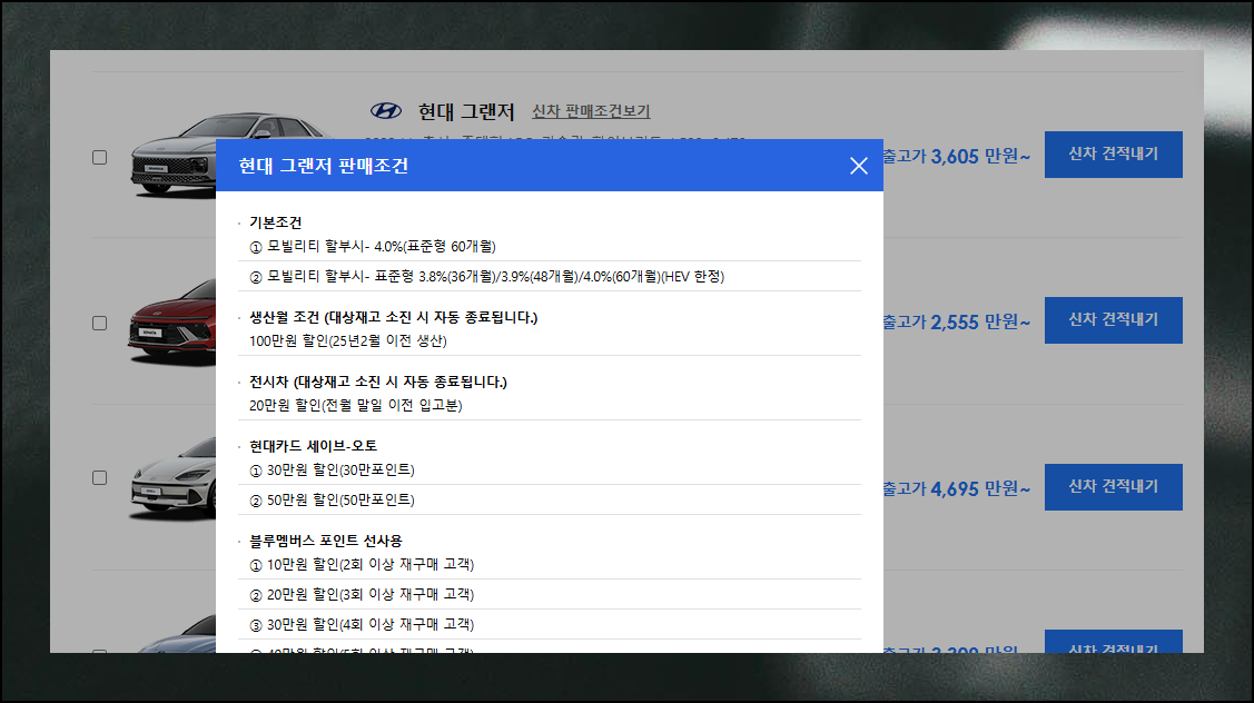 검색 결과 중 인기 있는 신차 모델 중 하나는 그랜져입니다. 가격표에서 출고가 3,605만원이라고 표시되어 있는데요. 이렇게 표시된 이유는 등급과 옵션 선택에 따라 최종 금액이 크게 달라지기 때문이에요. 현대자동차 구매 시 원하는 사양을 정확히 파악해야 실제 구매비용을 알 수 있습니다.