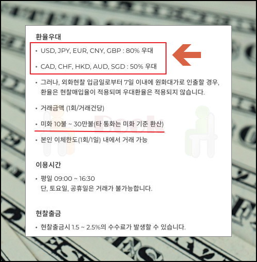환율우대 부분을 보면 80% 수준으로 달러 환전 싸게 하는 방법이 맞다는 것을 알 수 있어요. USD, JPY, EUR, CNY, GBP의 경우에는 80% 수수료 우대를 받을 수 있고요. CAD, CHF, HKD, AUD, SGD 토오하의 경우에는 50% 수수료 절감 효과를 얻을 수 있어요.