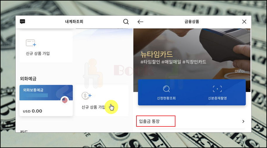 지금부터 시작할 환전 싸게 하는 방법은 제일은행 외화예금 통장이 있어야 진행할 수 있어요. 어플에 통해서도 신규 상품 가입이 가능하오니 참고해 주세요. 외화예금 만드는 방법은 간단해요. 조회에서 신규 상품 가입 버튼을 눌러 주세요. 그럼 새로운 페이지가 열리는데요. 입출금 통장을 터치해 주세요.