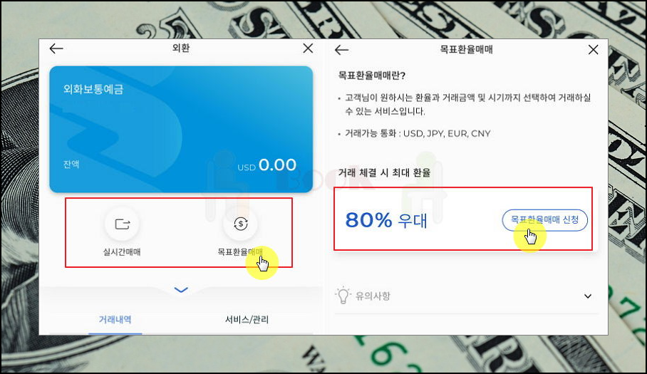 화면 상단을 보시면 실시간 매매와 목표 환율 매매가 있어요. 말 그대로 지금 당장 달러 환전을 할 수도 있고, 자신이 정한 환율로 환전을 하실 수 있어요. 최대한 싸게 환전을 하고 싶다면 목표 환율 매매 방법을 이용하는 것이 좋겠죠? 해당 버튼을 눌러보세요. 그럼 수수료 80% 우대를 받을 수 있다고 나타나요. 수수료를 정말 싸게 하는 곳은 90%도 있는데요. 보통 이러한 곳은 100달러 까지만 가능해요. 직접 영업점을 방문해야 하거나 공항 ATM 기기에서만 출금할 수 있는 제약 조건이 있는 경우도 많죠.