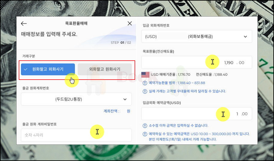목표환율매매를 클릭해 보았어요. 가지고 있는 원화를 팔고 달러를 살 수 있어요. 반대로 외화를 원화로 싸게 환전을 할 수도 있죠. 앱을 이용하는 방법은 쉬워요. 출금 원화 계좌번호, 비밀번호, 목표 환율, 입금외화 예약금액을 입력하기만 하면 돼요.
