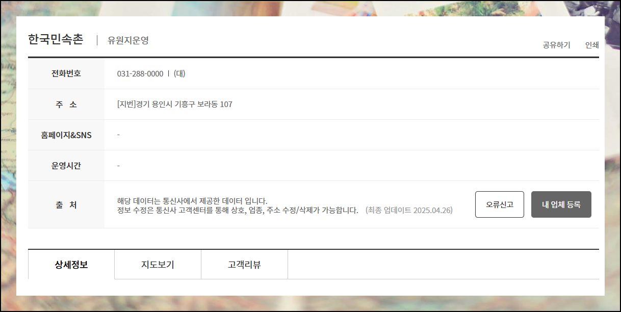 다음지도에서 정보가 나오지 않는 경우, 114 온라인 사이트를 활용해보세요. 새로 오픈한 매장이나 소형 가게도 114에서는 대부분 정보를 찾을 수 있습니다.