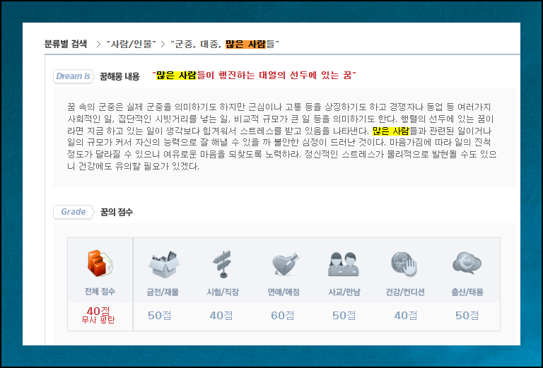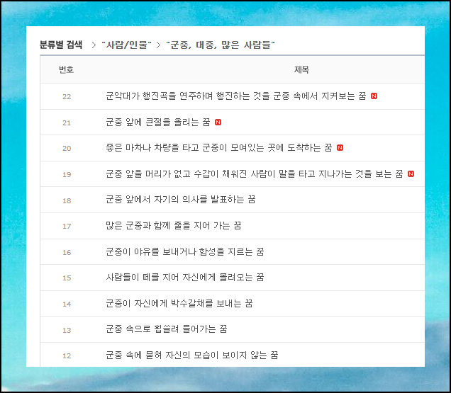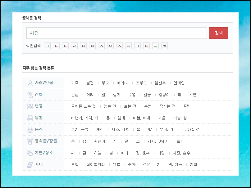 분류별 검색 기능을 통해 무료 꿈해몽 풀이 서비스를 이용해볼게요. 앞서 말한 사람 유형보다 훨씬 더 다양한 범주가 있음을 발견할 수 있어요.