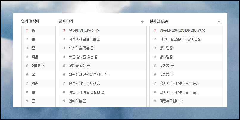 인기 검색어를 통해 요즘 이용자들이 많이 찾는 꿈이 무엇인지 알 수 있어요.