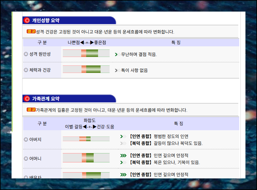 "사주 넣기" 후 오른쪽 화면에서 나의 성향과 가족관계에 대한 정보를 살펴볼 수 있어요. 실제 점집처럼 긍정적인 이야기뿐만 아니라 불운한 내용도 솔직하게 알려줍니다.