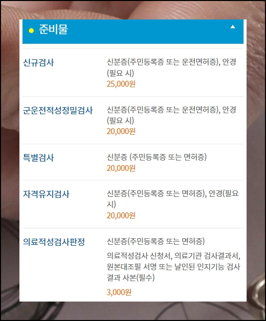 테스트 종류에 따라 준비물이 달라질 수 있으니 주의하세요. 자격유지검사 평가를 받을 때에는 평소 안경을 착용하신다면 반드시 가져오셔야 합니다. 또한 신분증과 수수료도 필수입니다.
