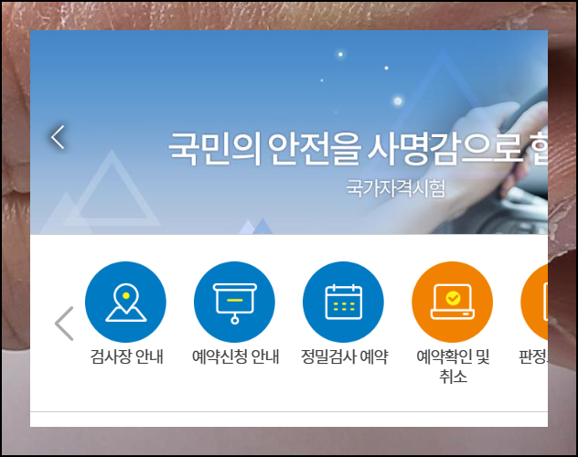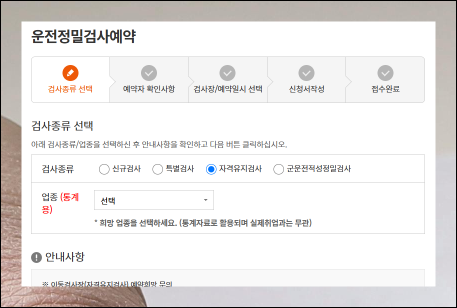 "운전정밀검사예약" 메뉴를 선택하면 테스트 종류와 업종을 선택하는 화면이 나타납니다. 본인에게 해당하는 항목을 정확히 선택한 후, 희망하는 장소와 날짜를 지정하고 신청서를 작성하면 예약이 완료됩니다.