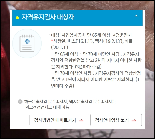 자격유지평가는 사업용 자동차를 운행하는 만 65세 이상 고령운전자가 대상입니다. 나이에 따라 주기가 다른데, 만 65세에서 70세 미만이라면 3년마다 검사를 받아야 하며, 만 70세 이상은 매년 받아야 하니 참고하세요.