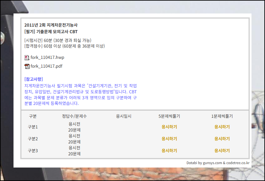 기출문제를 온라인으로 제공하는 사이트에서는 누구나 쉽게 자료를 무료로 다운로드 받을 수 있도록 해 놓았습니다. 더불어 사이트 내에서 바로 지게차 모의고사 테스트를 진행할 수도 있죠.