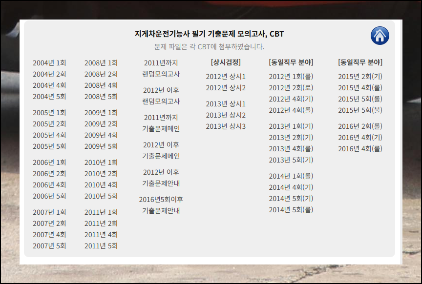 홈페이지 상단의 '필기문제' 메뉴를 클릭해 주세요. 이 버튼을 누르면 무료로 이용할 수 있는 필기시험 기출문제 리스트가 나타납니다.