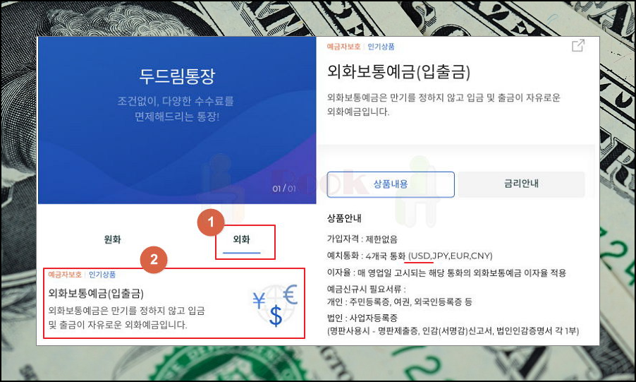 입출금 통장에서 외화를 클릭하면 외화보통예금 통장을 만들 수 있어요. 어느 때나 외화의 입금과 출금을 할 수 있는 통장인데요. 엔화, 유로화, 위완화 통장도 만들 수 있어요. 달러 환전을 싸게 하기 위해서 외화 통장을 만들어 주세요.