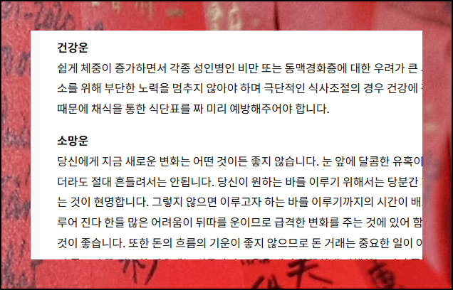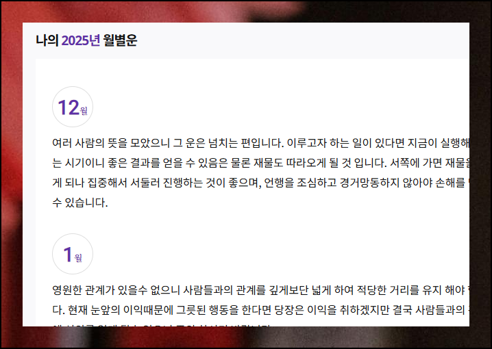 각 월별로 어떤 좋은 소식이 있고 무엇을 조심해야 하는지 알려주는 월별운이 제공됩니다. 모든 것이 완벽히 들어맞는다고 할 수는 없지만, 위험 시기를 피하는 것은 현명한 선택이 될 수 있습니다.