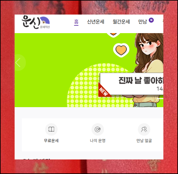 이 웹사이트에서는 유료 서비스도 제공하지만, 사주팔자를 포함한 대부분의 서비스는 비용 없이 이용할 수 있어요. 메인화면에서 좌측편에 보면 "무료운세" 버튼을 찾을 수 있습니다.