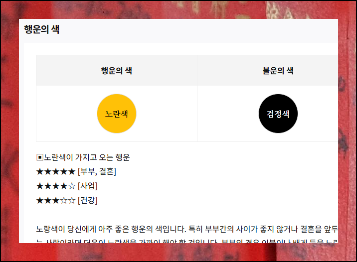색은 우리 일상에 큰 영향을 줍니다. 의상 컬러에 따라 하루의 분위기가 달라질 수 있어요. 예를 들어 노란색은 부부 금술을 좋게 한다고 하니, 결혼한 분들은 침실 인테리어에 반영해보세요. 당신의 행운색을 알고 적용하면 좋은 기운을 끌어당길 수 있답니다.