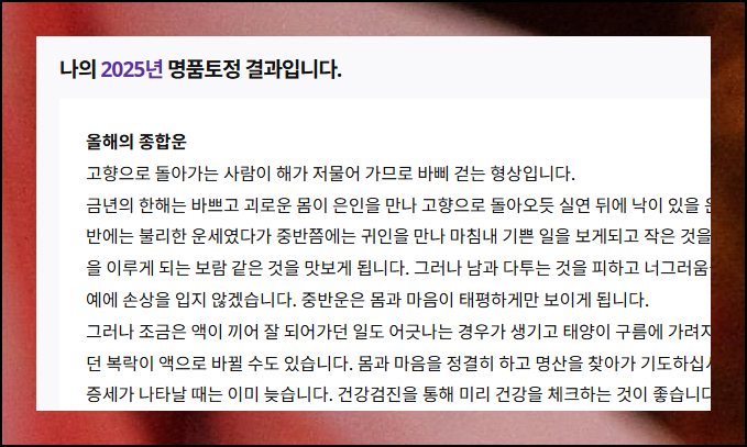 사주팔자를 통해 올해의 전반적인 운세를 파악할 수 있어요. 세부 내용은 뒤에서 자세히 나옵니다. 이 부분에서는 전체적인 흐름을 이해하는 느낌으로 훑어보세요. 한 해의 큰 그림을 간단히 파악하는 데 도움이 될 거예요.