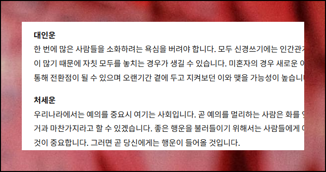 사람마다 행운을 가져다주는 숫자가 다를 수 있어요. 결과에서 안내하는 행운의 숫자를 일상에서 활용해보세요. 어떤 이에게는 불길한 수치가 당신에게는 행운의 숫자일 수 있으니 참고하세요. 사주팔자 서비스를 통해 알게 된 이 숫자들을 여러 상황에서 활용해보세요.