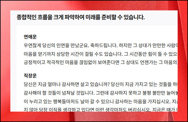 사주팔자를 통해 올해의 전반적인 운세를 파악할 수 있어요. 세부 내용은 뒤에서 자세히 나옵니다. 이 부분에서는 전체적인 흐름을 이해하는 느낌으로 훑어보세요. 한 해의 큰 그림을 간단히 파악하는 데 도움이 될 거예요.