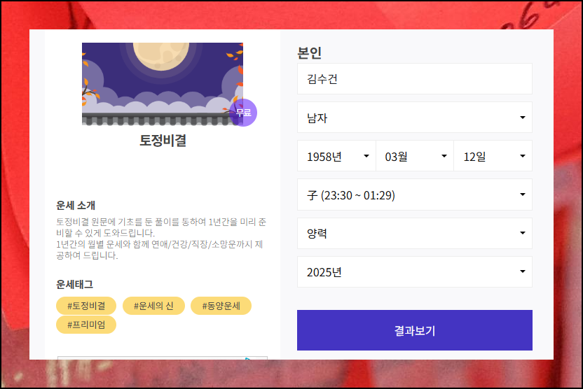 해당 버튼을 클릭하면 여러 가지 역술 서비스가 나타나는데요. 여기에서 간단히 보기 좋은 토정비결을 선택하면 됩니다.