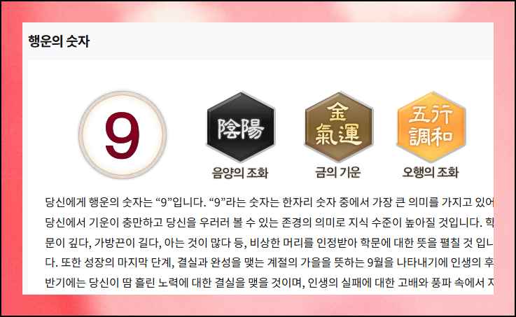 사람마다 행운을 가져다주는 숫자가 다를 수 있어요. 결과에서 안내하는 행운의 숫자를 일상에서 활용해보세요. 어떤 이에게는 불길한 수치가 당신에게는 행운의 숫자일 수 있으니 참고하세요. 사주팔자 서비스를 통해 알게 된 이 숫자들을 여러 상황에서 활용해보세요.