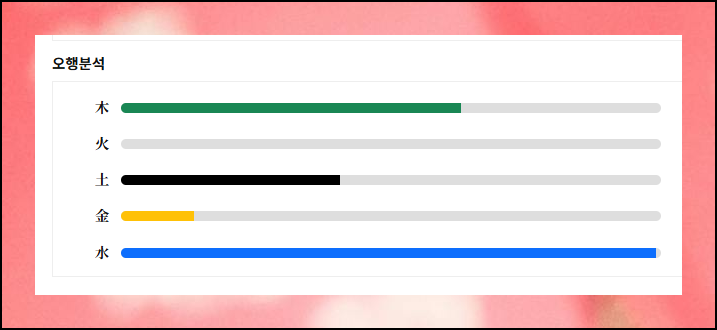 분석이 완료되면 이름, 출생 기록, 사주명식과 오행이 표시됩니다. 오행과 사주명식 보는법을 모르셔도 걱정하지 마세요. 이를 분석하여 만들어진 설명을 아래에서 볼 수 있습니다.