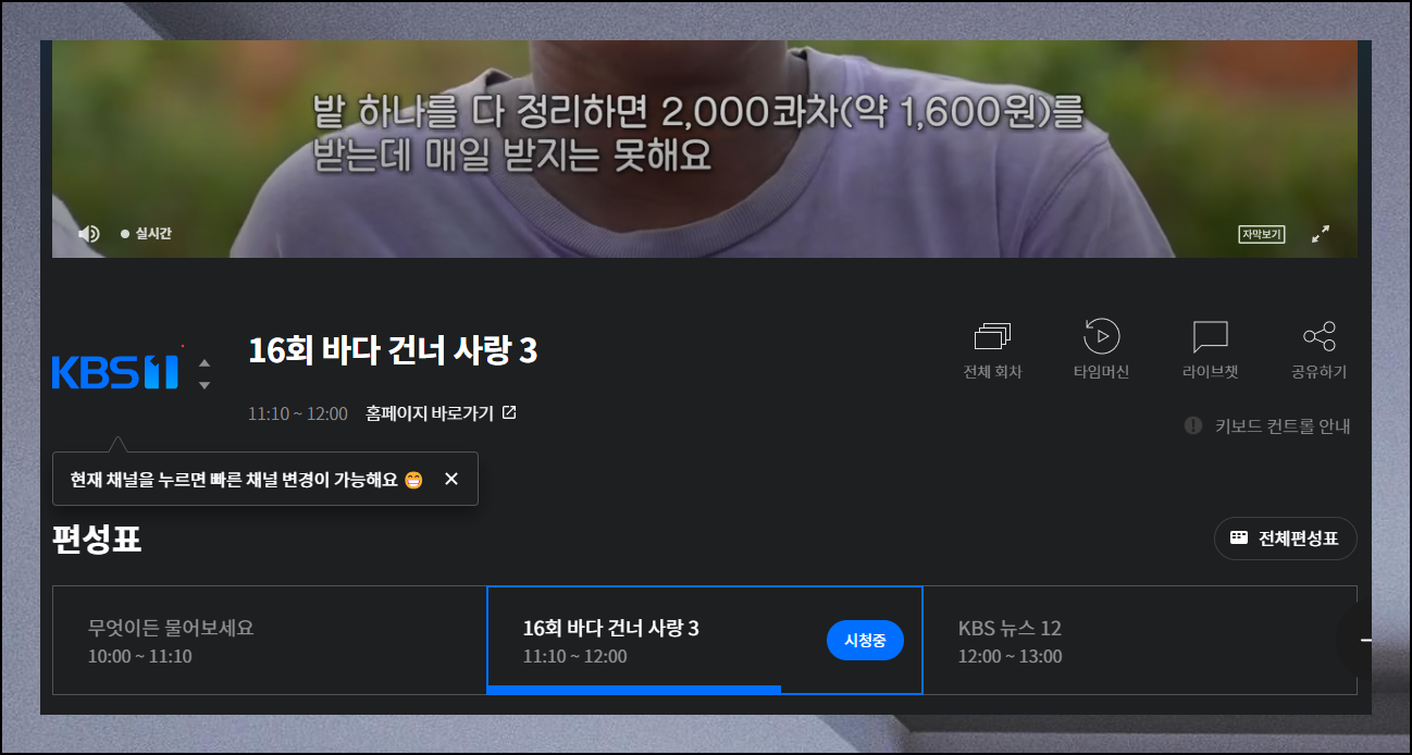 시간표에서 ON AIR 표시가 되어 있는 프로그램을 클릭해 보세요. 그럼 바로 해당 프로그램을 생방송으로 볼 수 있습니다. 여러 가지 다양한 컨텐츠가 준비되어 있으니 취향에 맞게 선택해 티비 보기를 진행해보세요.