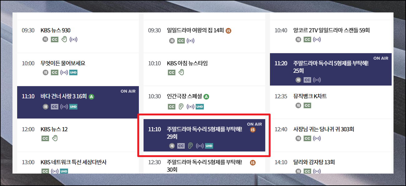 시간표에서 ON AIR 표시가 되어 있는 프로그램을 클릭해 보세요. 그럼 바로 해당 프로그램을 생방송으로 볼 수 있습니다. 여러 가지 다양한 컨텐츠가 준비되어 있으니 취향에 맞게 선택해 티비 보기를 진행해보세요.