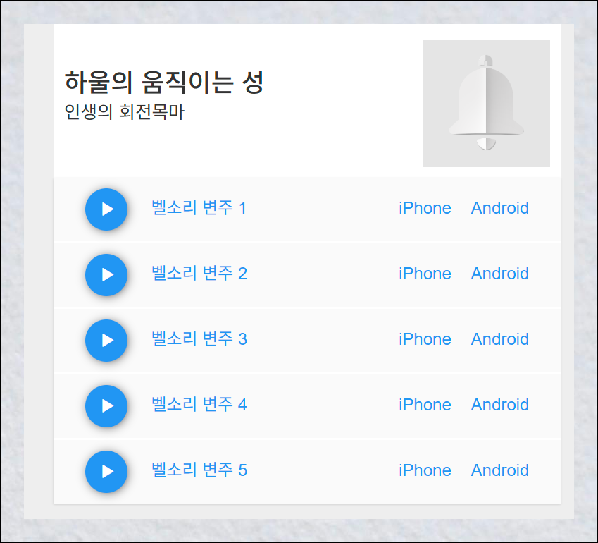 mp3 형식으로 제공되어 아이폰 소유자는 아이튠즈를, 안드로이드 사용자는 기기 설정 메뉴를 통해 간편하게 휴대폰 벨소리로 지정할 수 있어요.