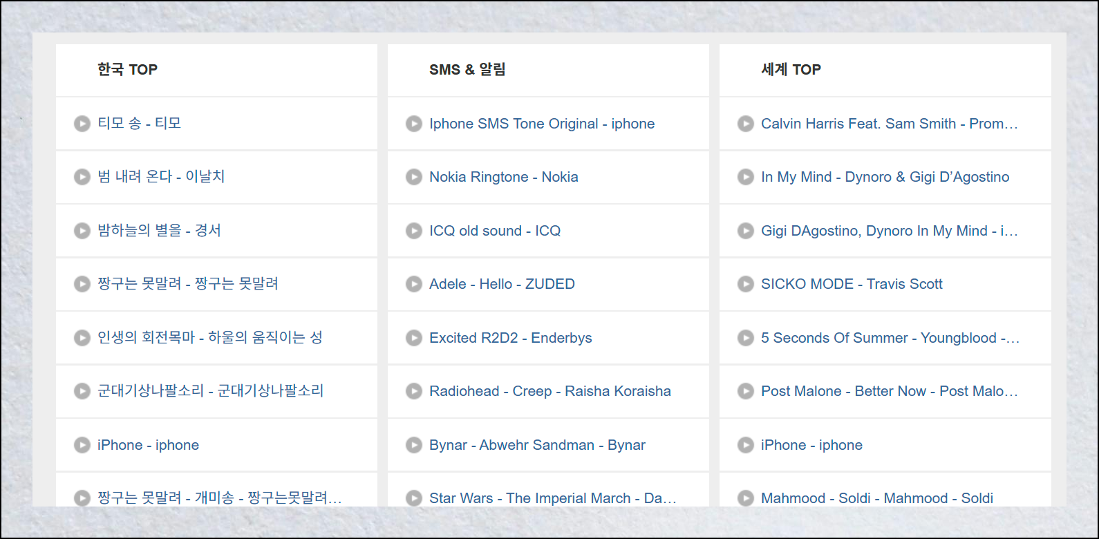 추천을 받았거나 마음에 드는 휴대폰 벨소리를 발견했다면 5가지 버전의 음원 중 원하는 것을 골라 다운로드하세요. 아이폰과 안드로이드 이용자를 위한 파일이 구분되어 있으니 자신의 단말기에 맞는 것을 선택하면 됩니다.