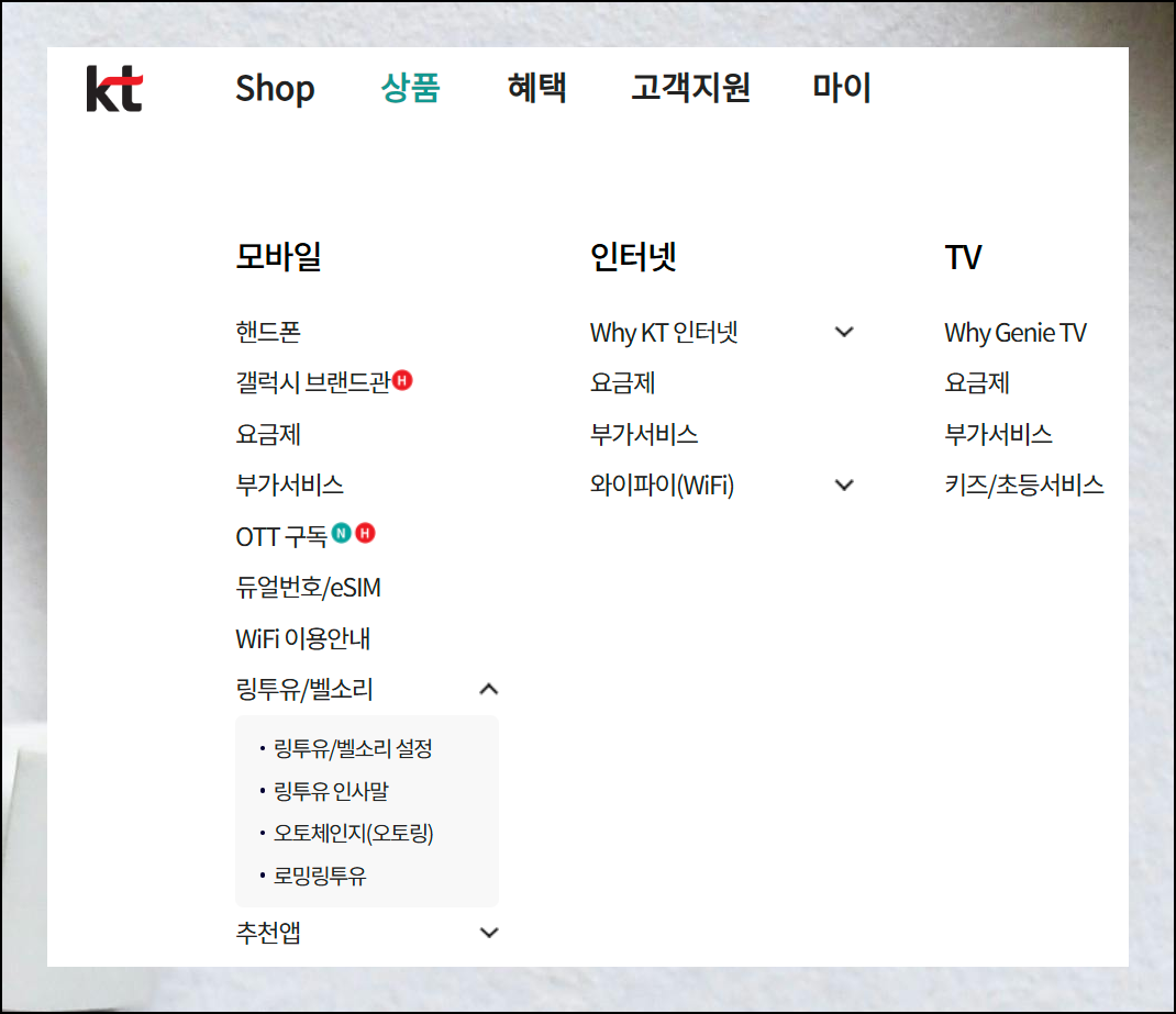 접속 후 [상품서비스] 메뉴를 클릭하고 [모바일 전용서비스]에서 [링투유/벨소리]를 선택하면 트렌디한 사운드들을 쉽게 찾을 수 있어요.