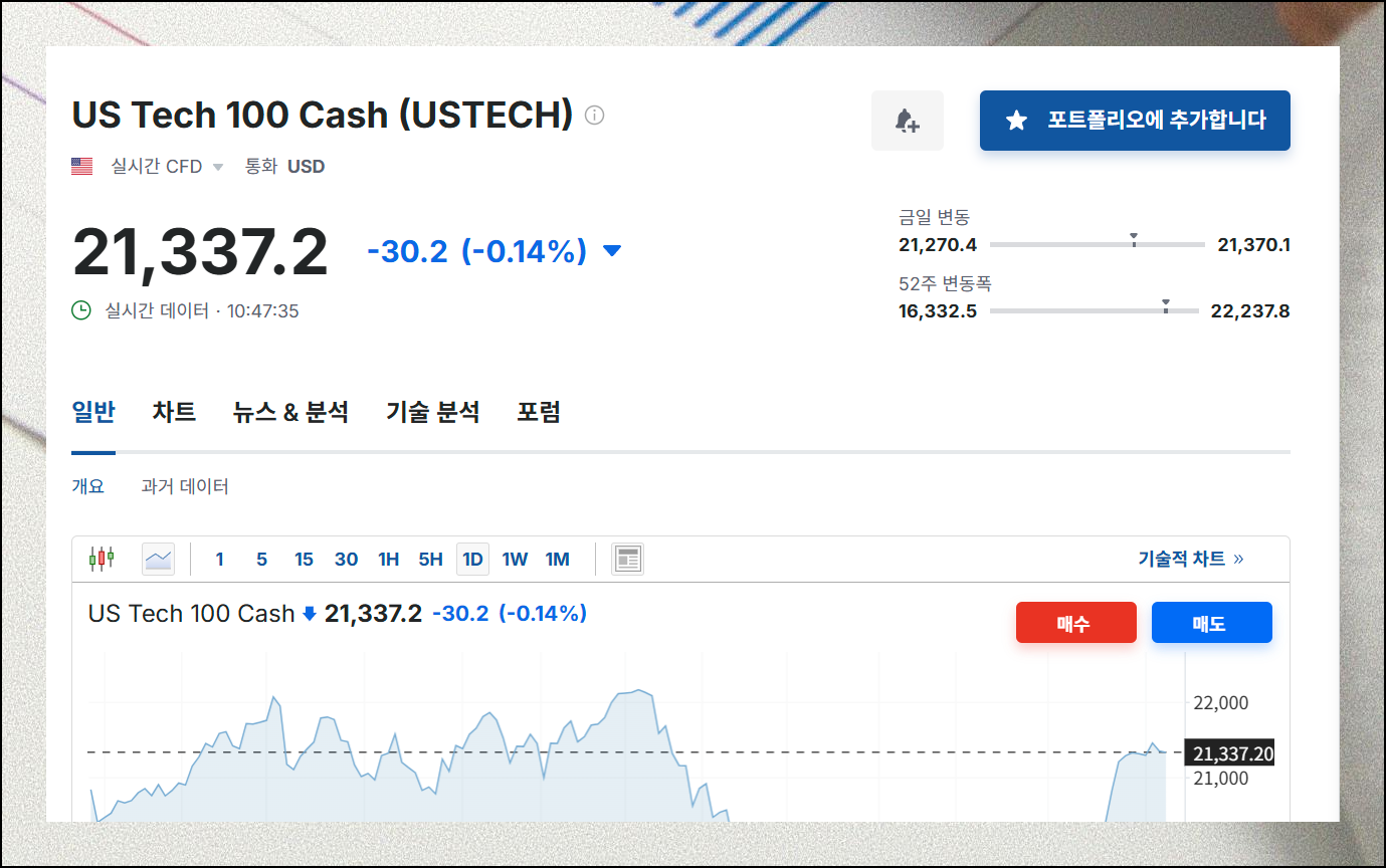 나스닥 선물을 더 자세히 알아보려면 우측 패널에서 해당 항목을 눌러보세요. 새롭게 열린 페이지에서는 실시간 차트, 최신 소식, 전문가 분석, 기술 지표, 포럼 등의 메뉴를 선택할 수 있습니다.